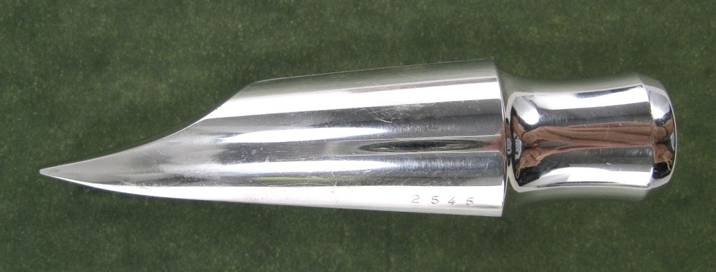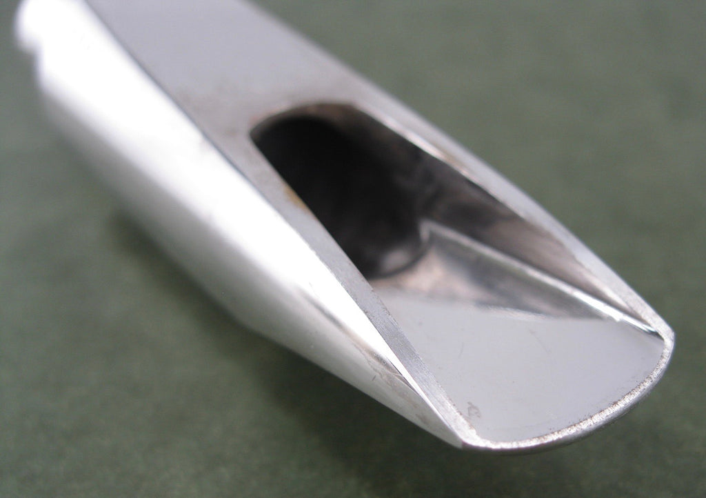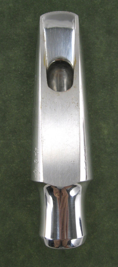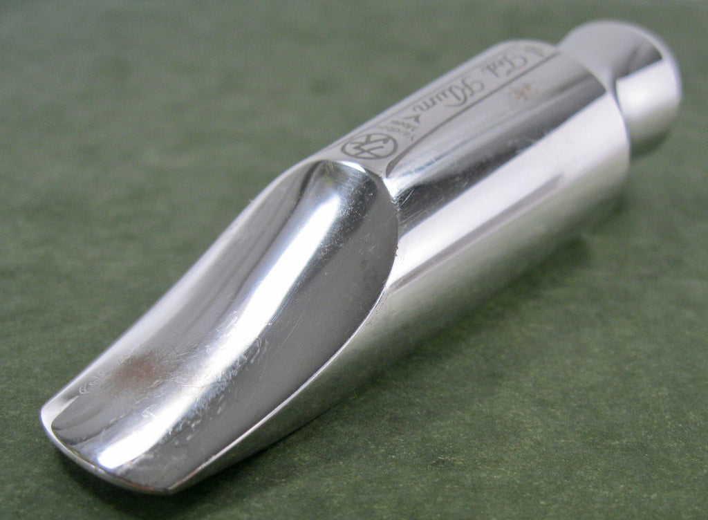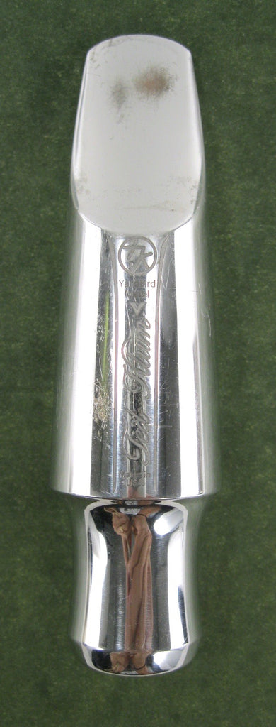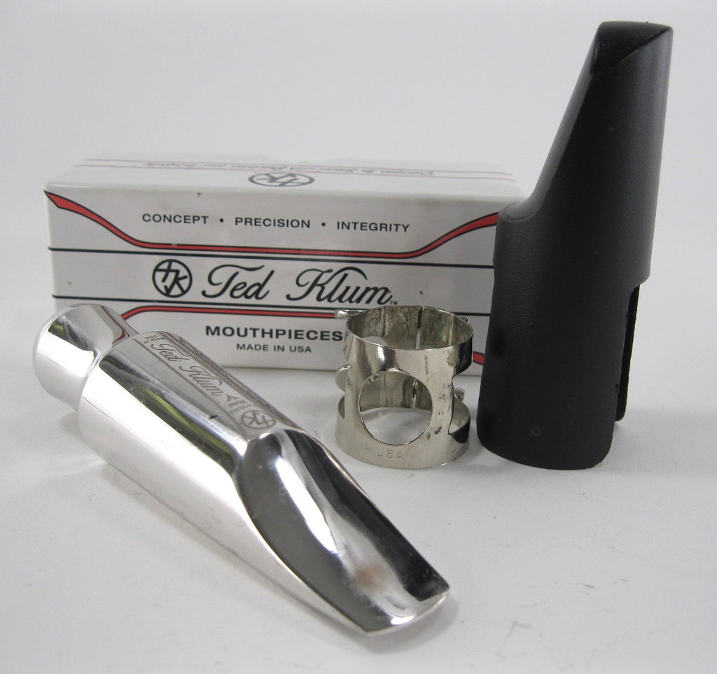Ted Klum New London Model Tenor Saxophone Mouthpiece. Marked, 8* and tip opening measures .115. Excellent condition with light wear to the plating on the beak. Oddly, this one is marked, "Yardbird Model", but it is definitely the New London Model. Rhodium plated brass. Includes ligature, cap and packaging.